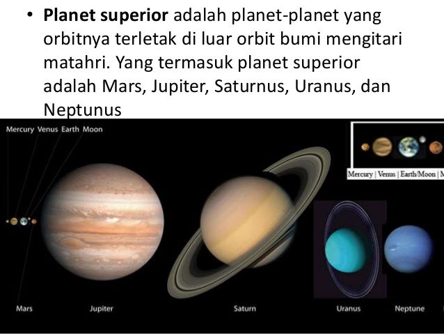 Planet Superior merupakan planet yang orbitnya terletak diluar orbit Bumi yaitu Jupiter Saturnus Uranus Neptunus.